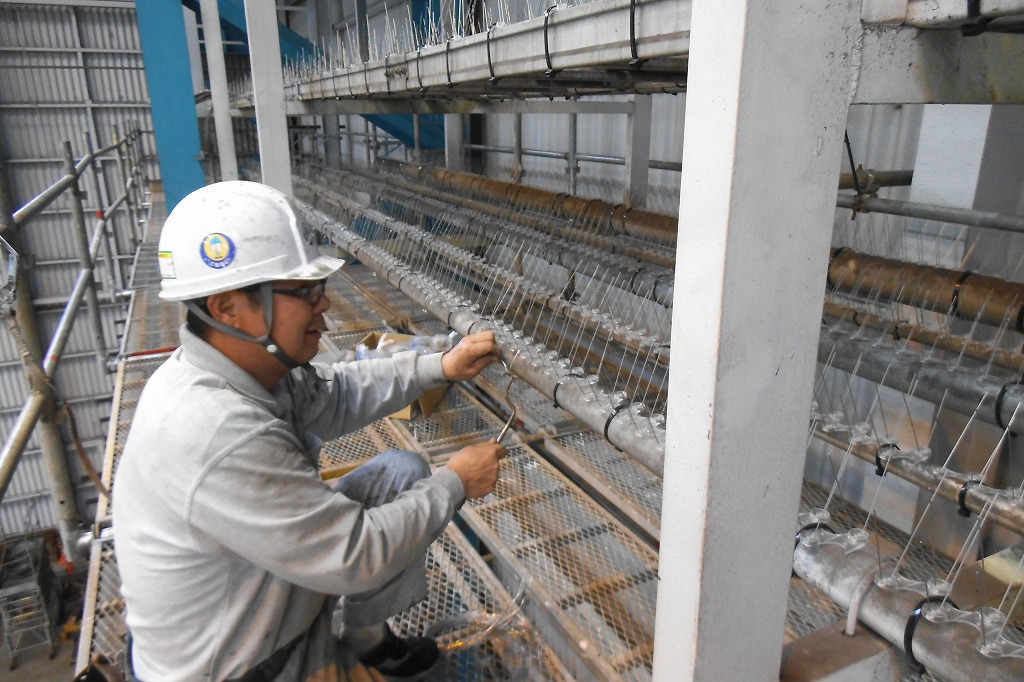 ![]() ステンレスワイヤーを固定するアンカーを設置 |