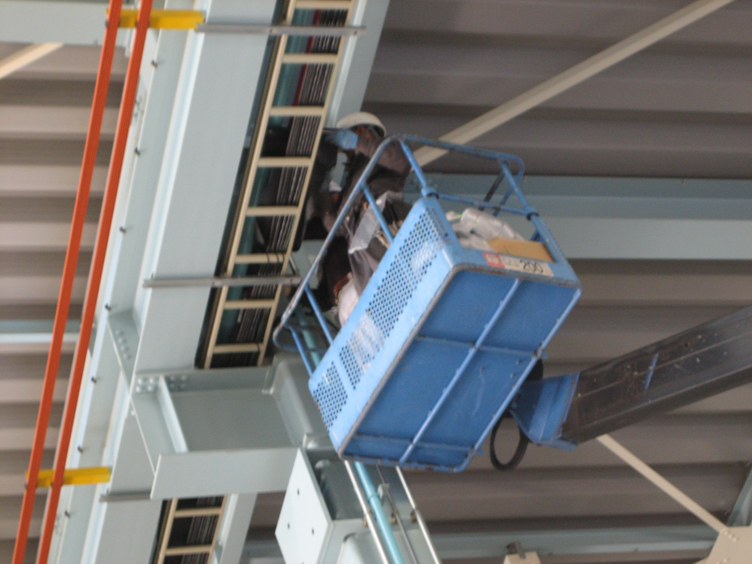 調査では鳩の巣が幾つか有るようですのでヒナ、卵の撤去が予想されます。事前に許認可申請をしっかり行ってからの作業開始となります。作業時間は夜20:00~翌5:00までの夜間作業 。ローリングタワー(仮設足場)を設置し、ヘルメット、安全体、安全ベストで安全に作業します。また、通行人や、床にゴミが飛散しないように人避け、飛散養生をします。